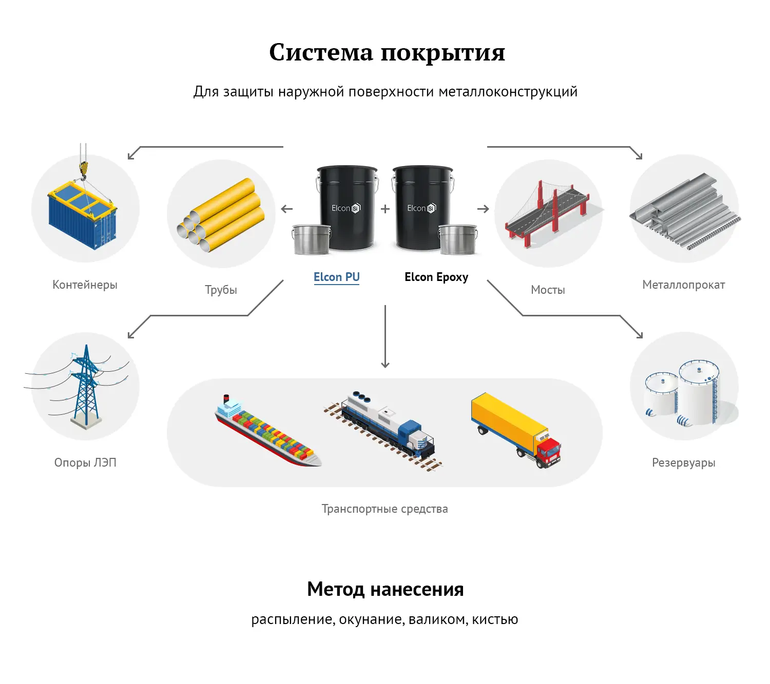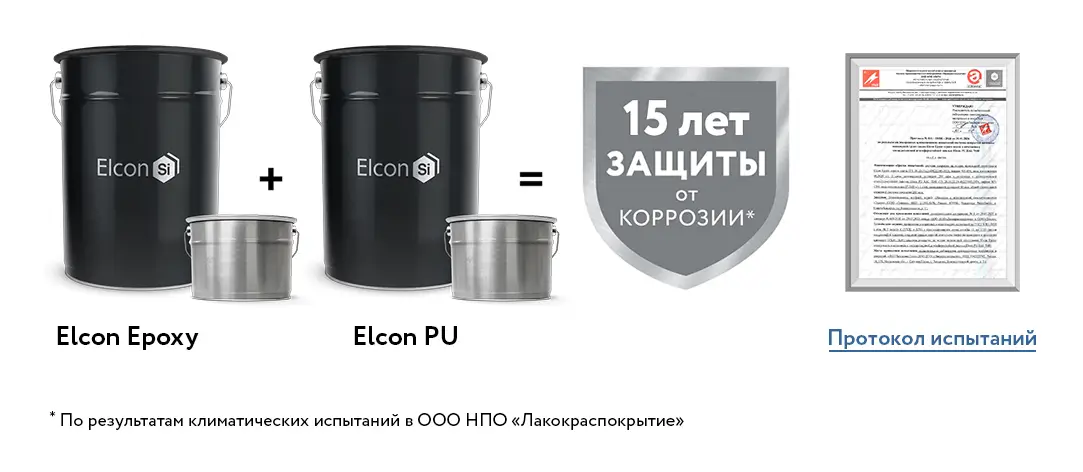 Эпоксидная грунт-эмаль Elcon Epoxy применяется как грунтовочный или промежуточный слой в системе лакокрасочных покрытий, а также как самостоятельное покрытие для антикоррозионной защиты наружной поверхности металлических конструкций (резервуары, мостовые сооружения, оборудование, изделия машиностроения), эксплуатирующихся в средне- и сильноагрессивной промышленной атмосфере (химическая, газовая, нефтяная, металлургическая отрасли), морском климате, при погружении в землю/воду (гидротехнические и портовые сооружения). Термостойкость покрытия: от –60°С до +125°С.